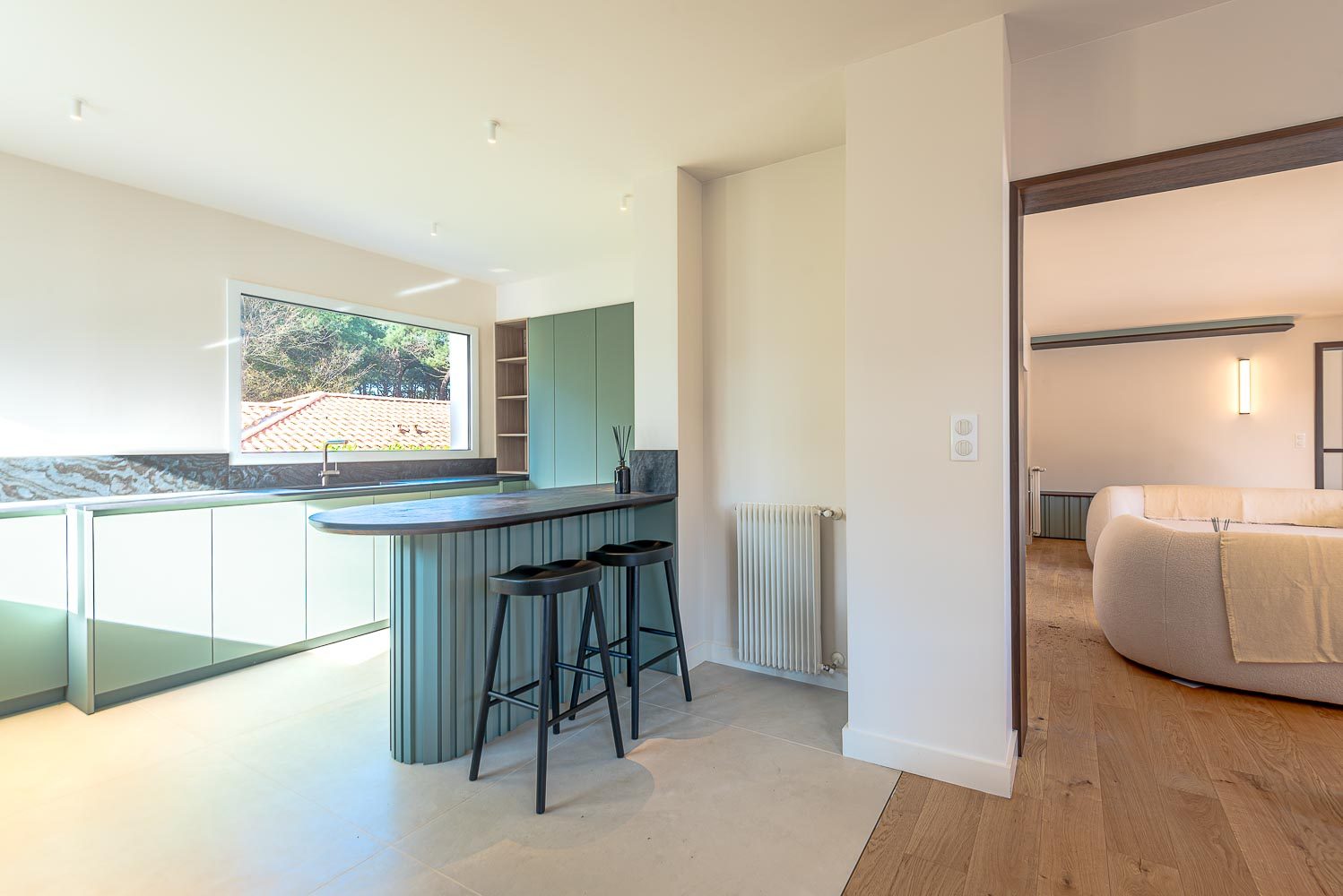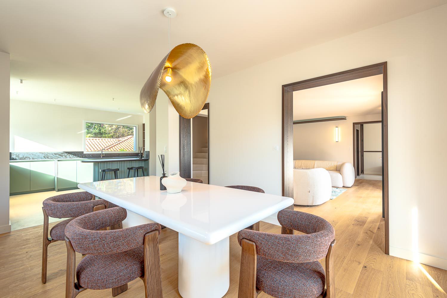 Tournées vers un environnement calme et verdoyant les pièces de vie s'ouvrent sur une belle terrasse avec piscine chauffée , la salle à manger se prolonge sur une spacieuse cuisine ouverte entièrement équipée et aménagée.