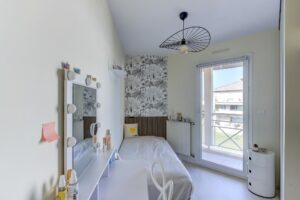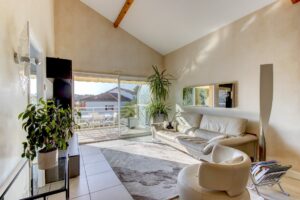 Il offre une vaste et lumineuse pièce de vie cathédrale prolongée par une terrasse de 14m².