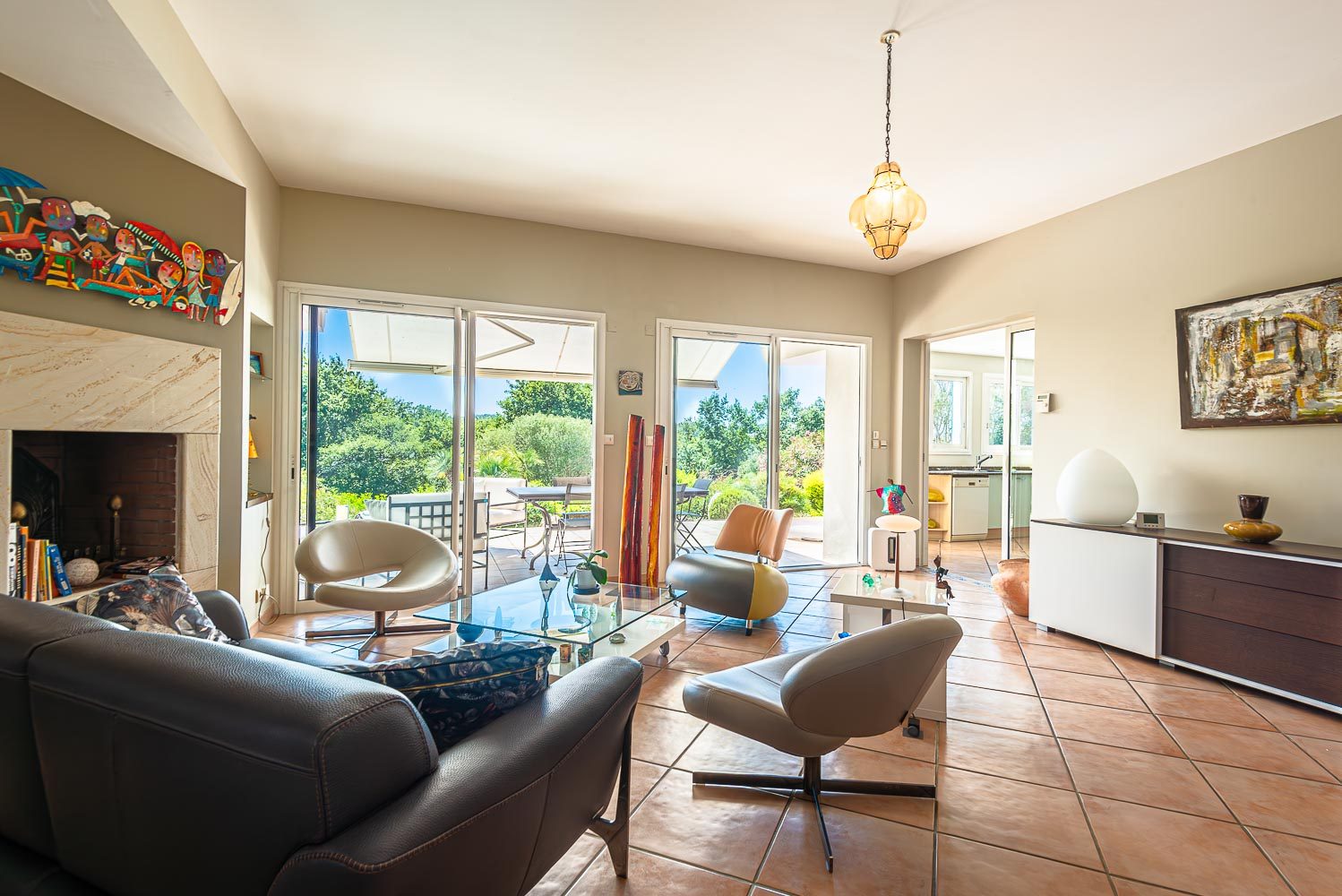 Le rez-de-chaussée dispose d'un bel espace de vie qui se prolonge par une terrasse et un jardin luxuriant avec piscine.