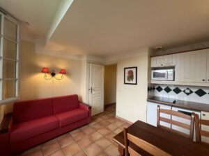 Il se compose d'une entrée, d'un séjour et d'une kitchenette équipée avec rangements d'une chambre-cabine, d'une salle de bains et WC.